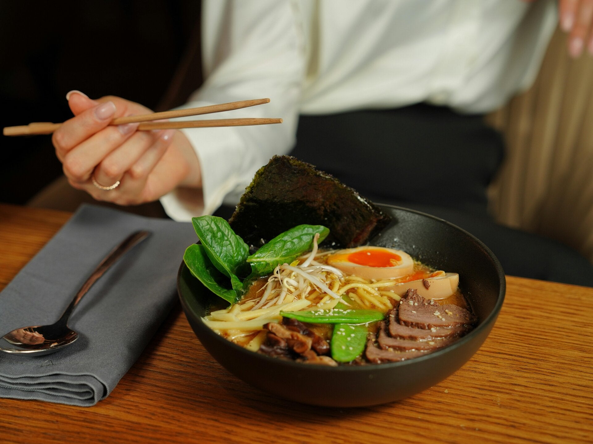 caldo cremoso y rico a base de huesos de cerdo, acompañado de panceta, alga, cebollín, hajitsuke tamago y germen de soya.